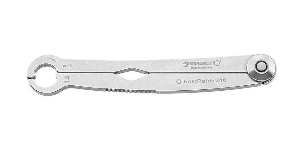 Трещоточный гаечный ключ Stahlwille FastRatch 240 размером 17 мм / 21/32". Запатентованная, зарегистрированная конструкция, специально для соединительных гаек. Изготовлен из закаленной и отпущенной нержавеющей стали. Используя один ключ, можно затянуть или ослабить гайки и болты в метрическом и дюймовом стандарте. Выдерживает экстремальные нагрузки, отличается чрезвычайной долговечностью. Обладает высокой прочностью на изгиб при малом весе, а также удобной для удерживания поверхностью, не режущей руку. Контактная поверхность ключа обработана так, что он удобно лежит в руке, даже когда используется в течение длительного периода времени и когда к ключу прикладывается значительное усилие.