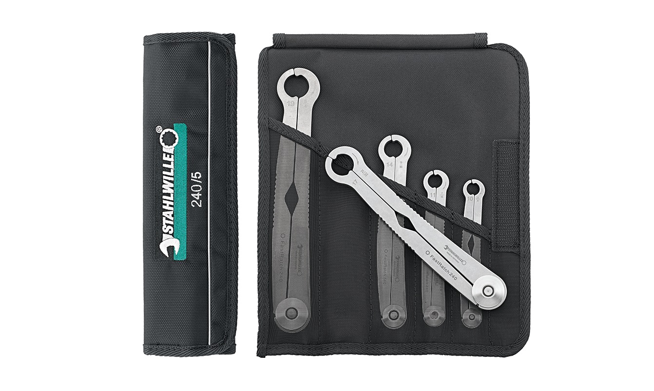 Набор трещоточных гаечных ключей Stahlwille FastRatch 240/5 в сумке. Запатентованная, зарегистрированная конструкция, специально для соединительных гаек. Изготовлены из закаленной и отпущенной нержавеющей стали. Используя один ключ, можно затянуть или ослабить гайки и болты в метрическом и дюймовом стандарте. Выдерживают экстремальные нагрузки, отличаются чрезвычайной долговечностью. Обладают высокой прочностью на изгиб при малом весе, а также удобной для удерживания поверхностью, не режущей руку. Контактная поверхность ключа обработана так, что он удобно лежит в руке, даже когда используется в течение длительного периода времени и когда к ключу прикладывается значительное усилие. Поставляются в рулонной сумке с застежкой-липучкой из прочного текстильного материала.
