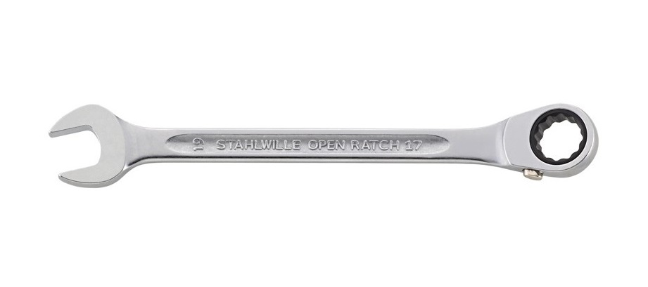Комбинированный гаечный ключ Stahlwille с трещоткой OPEN-RATCH. Размер ключа 14 мм. Реверсивная 12-гранная трещотка с 72 зубцами, для работ в ограниченном пространстве, с рабочим шагом всего 5°. Изготовлен из кованой легированной стали, полностью хромированный. Одна сторона представляет собой рожковый ключ, другая – накидной кольцевой ключ с наклоном головки 15°.