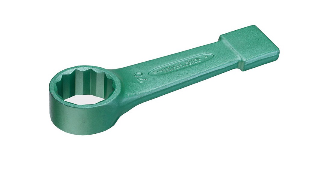 Ударный накидной односторонний гаечный ключ серии 8 размером 85 мм. Изготовлен из высокопрочной легированной хромом стали, устойчивой к высоким нагрузкам. Окрашен в зеленый цвет для легкой идентификации. Имеет рукоятку, специально предназначенную для использования с молотком. Ключ предназначен для монтажно-демонтажных работ с нагруженным, заржавевшим или прикипевшим крепежом, для ударной затяжки и ослабления гаек при помощи кувалды или пневматического молотка. Используется при ремонте и облуживании автотранспорта, промышленного оборудования, трубопроводов, в железнодорожной области.