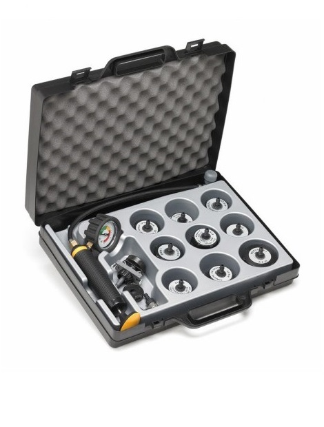 Оборудование для опрессовки  (проверки герметичности) системы охлаждения автомобилей. Поставляется в кейсе для хранения в комплекте со всеми адаптерами необходимы для испытания европейских и иностранных автомобилей. Поставляется с длинными, гибкими шлангом для работы в трудодоступных местах. Различные адаптеры, входящие в комплект, можно легко и быстро заменить, так как они оснащены быстросъемной муфтой.