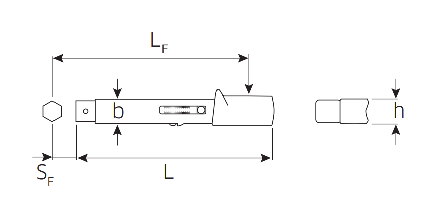Предельный динамометрический ключ с гнездом под сменные инструменты, двойной предупредительный щелчок, с предохранительным замком (QuickRelease) и фиксатором (размер 5-65), моментальная установка (разм. 2-65), двойная шкала Н м/ft.lb, Н м/inch.lb. (разм. 5-80) и длительная точность.